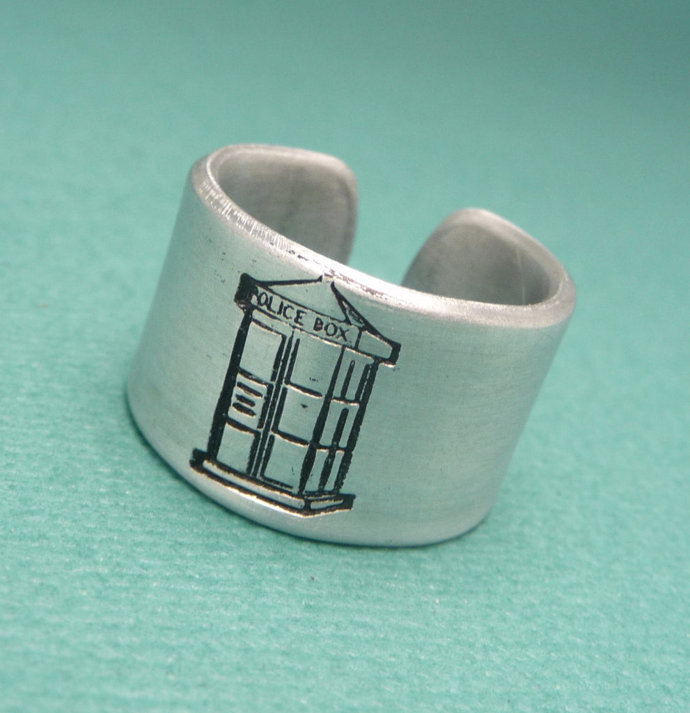 "The girl who waited" - this is a double sided version of my popular ring in honor of Amy Pond. It has the words stamped on the inside, and my exclusive TARDIS stamp stamped on the outside.