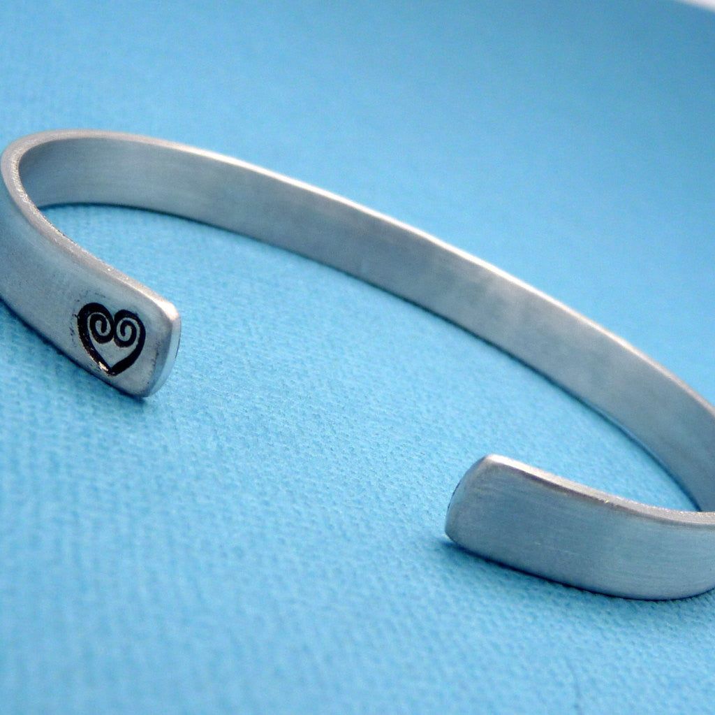 ABOUT THE BRACELET: The ¼ inch wide cuff bracelet is 6 inches long, and flexible so it can fit on almost any wrist. They're available in your choice of Aluminum, or Sterling Silver.